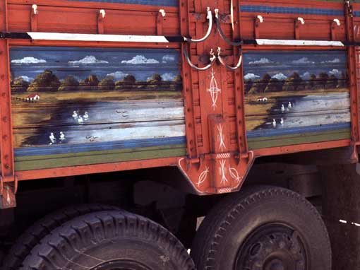 | ...a local truck, first stage of our journey home. Notice the one wheel missing - quite common, and our driver stopped every four or five miles to tighten the wheel nuts, mainly because his spanner was broken and only about six inches long - but I suppose he knew his business. After all, we were the ones who had blown our nice diesel bus up ! Pair of pictures were very common - their narrow prayer mats were similar. cont below. |